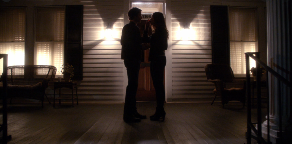 Ele divide uma cena fofa de despedida com a Caroline e com a Elena, cujo corpo eles já encontraram na Mystic Falls High School, mas que ainda não acordou. E depois, vai viver em paz, com.