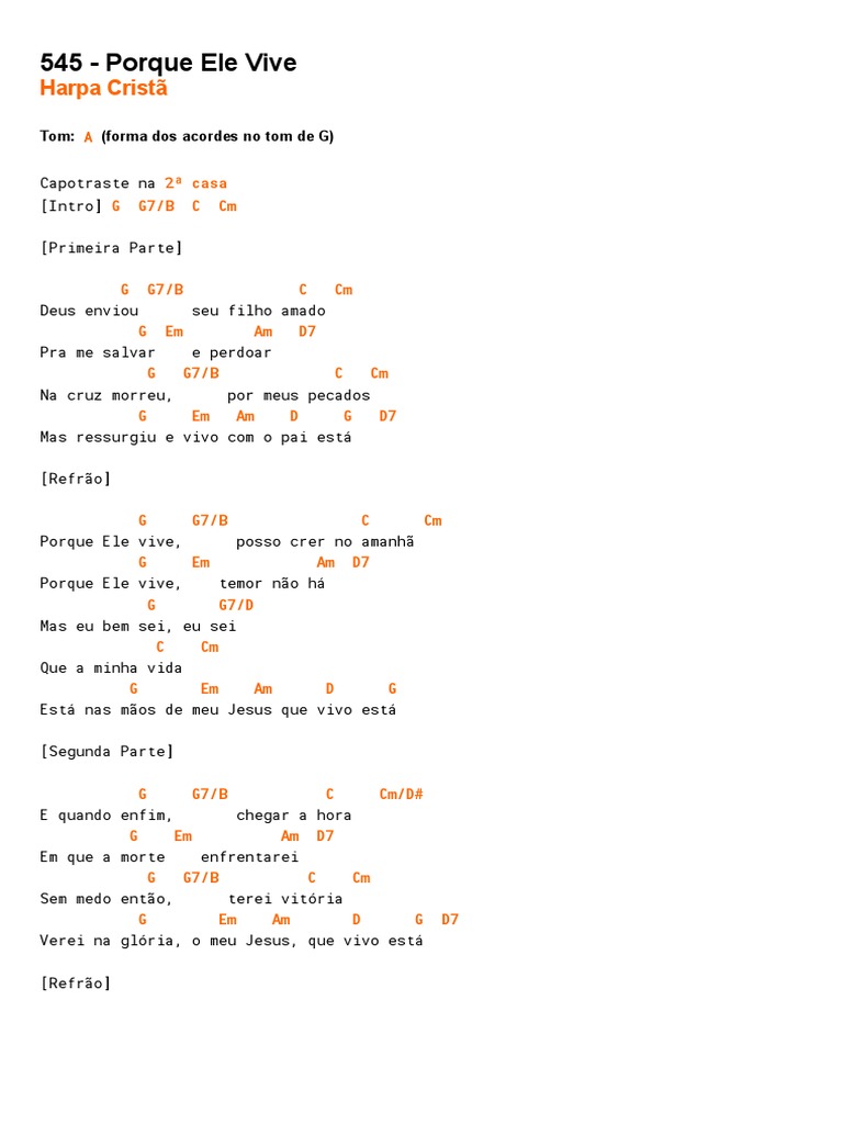 Share, download and print free sheet music of Hino Da Harpa Cristã 545 - Porque Ele Vive Gloria Geither for piano, guitar, flute and more with the world's largest community of sheet music creators, composers, performers, music teachers, students, beginners, artists and other musicians with over 1,000,000 sheet digital music to play, practice, learn and enjoy.