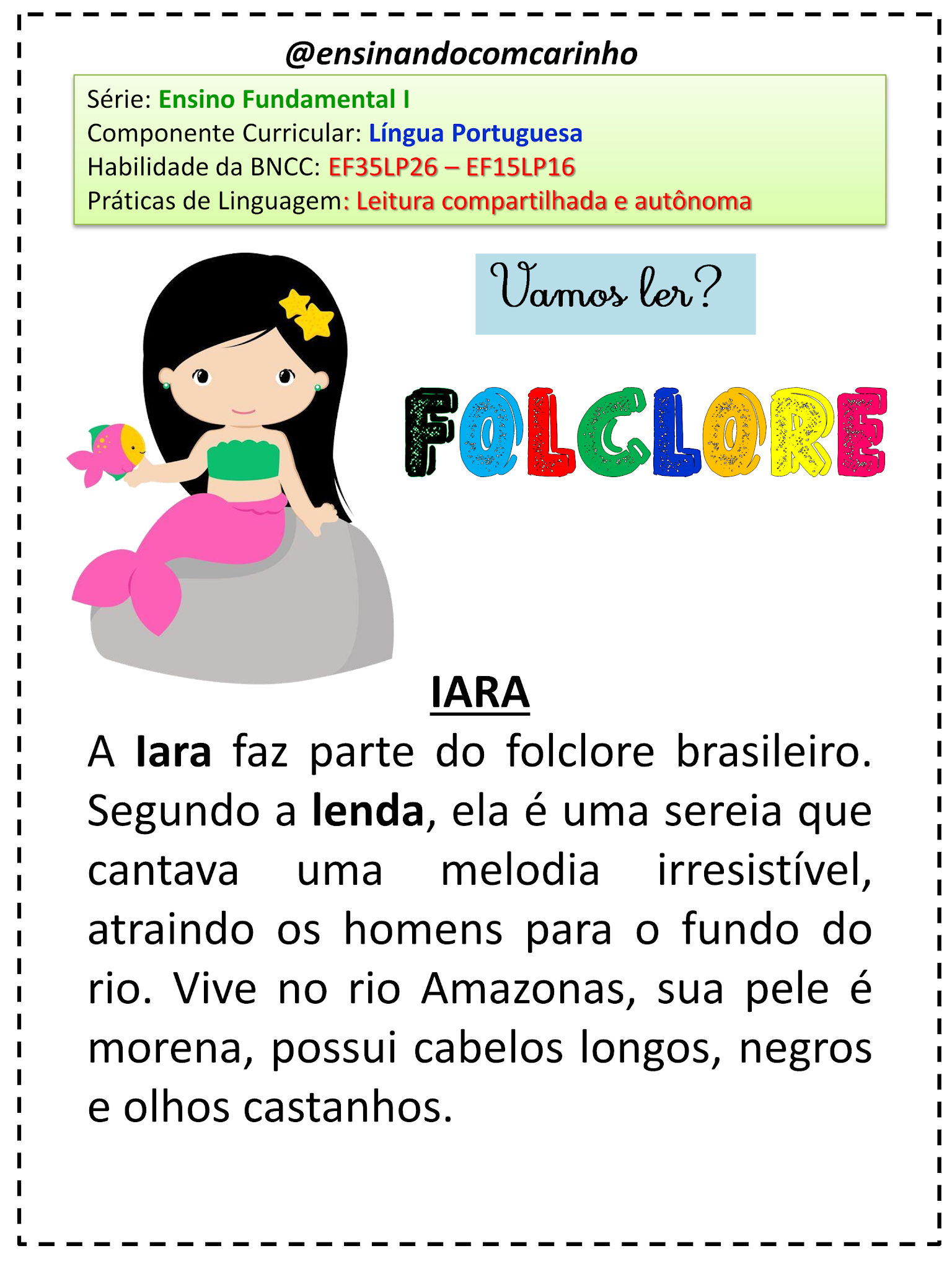 As lendas e os personagens do folclore brasileiro são elementos que fazem parte da nossa cultura há séculos. Alguns exemplos são o saci-pererê, o curupira, o boitatá e a iara. O saci-pererê e o curupira são dois famosos personagens do folclore brasileiro. Imprimir. Texto: A+. A- Ouça o texto abaixo! PUBLICIDADE.