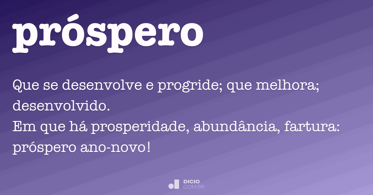 Significado de Próspero no Dicio, Dicionário Online de Português. O que é próspero: adj. Que se desenvolve e progride; que melhora; desenvolvido. Em que há prosperidade, abundância, fartura: próspero ano-novo! Que obteve sucesso e êxito; bem-sucedido. Que conseguiu acumular bens e riquezas;.
