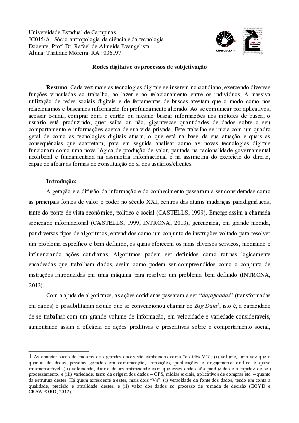 (PDF) Redes digitais e o processo de subjetivação Thatiane Moreira Thatiane moreira Academia.edu