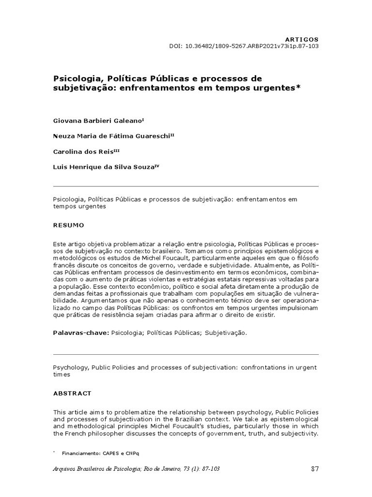 Texto 5 Psicologia, Políticas Públicas e Processos de Subjetivação PDF Psicologia Michel