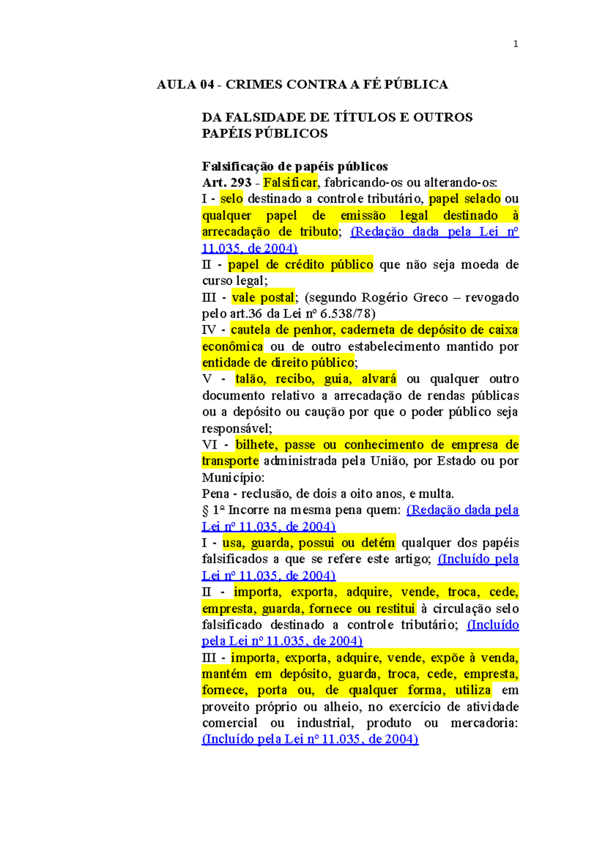 04 Crimes Contra A FÉ PÚblica Falsidade de Títulos e outros papéis públicos 1 AULA 04