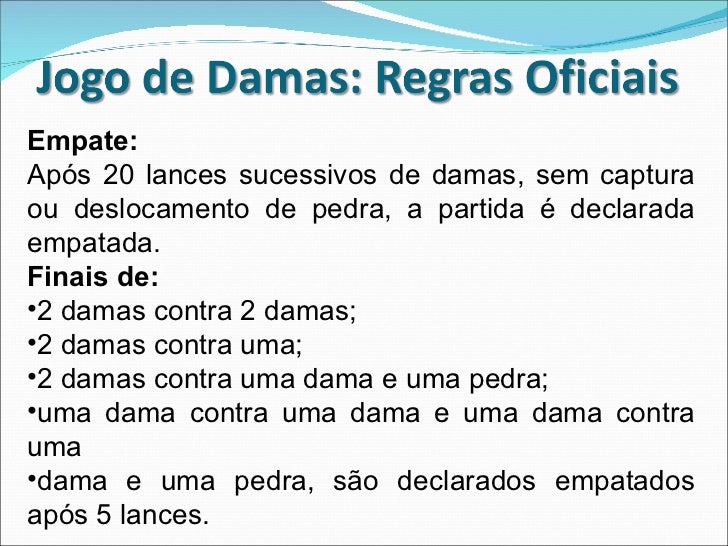 Regra de Empate. A partir de qualquer ponto da partida se ocorrerem 20 (vinte) lances sucessivos de Damas, sem captura ou movimento de peças comuns. Se uma mesma posição se produzir pela terceira vez, cabendo ao mesmo jogador o lance será considerado um empate. Se um jogador possuir três damas contra uma dama do outro jogador, será.